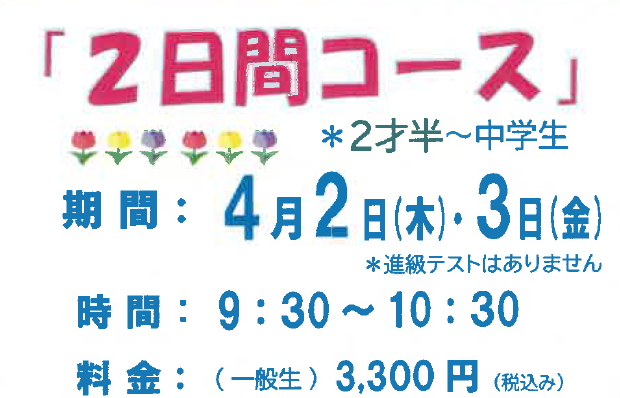 ※お休みの場合の振替授業はありませんが、新入会の方に限り、1日目または2日目は振替いただけます。